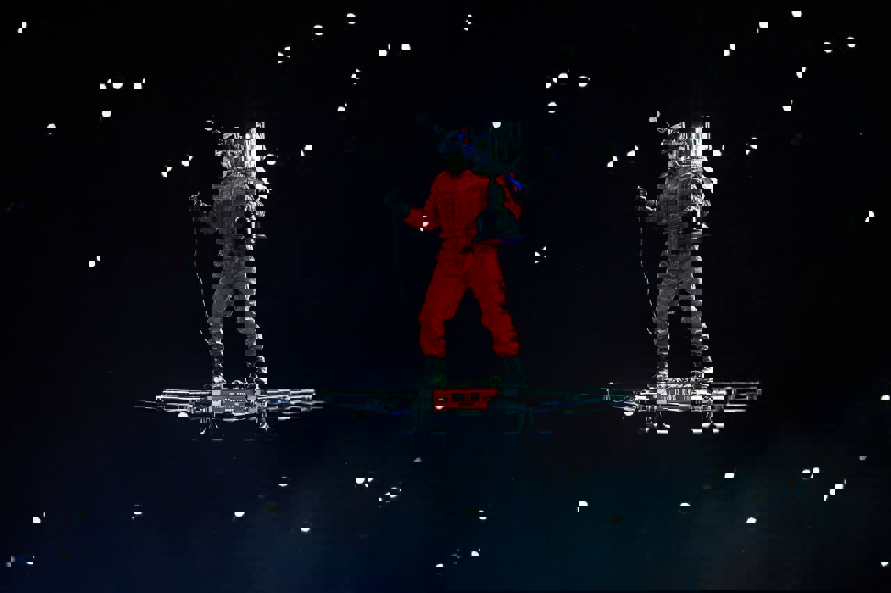 با نزدیک شدن به زمان مراسم، تمام چراغهای ورزشگاه خاموش شدند و فضا در تاریکی مطلق فرو رفت. در این لحظه، در اقدامی خیرهکننده، مردی سوار بر یک پهپاد، جام کوپا دل ری را از آسمان به مرکز زمین آورد. این نمایش بصری که ترکیبی از فناوری پیشرفته و هنر بود، با موسیقی حماسی و نورپردازی هماهنگ همراه شد و هواداران را به وجد آورد.