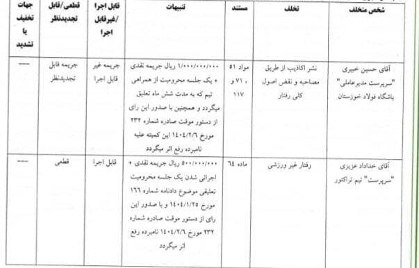 آرای صادره از سوی کمیته انضباطی به شرح زیر است: