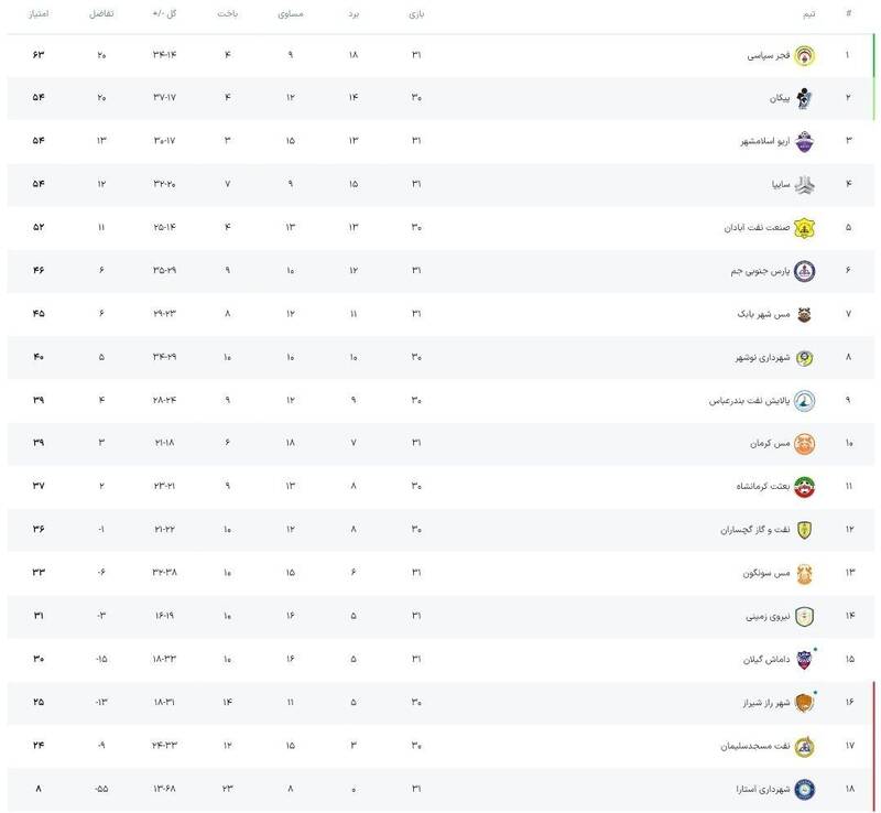 فجر سپاسی صعودش را به تاخیر انداخت/ تساوی سایپا و آریو به سود پیکان +جدول