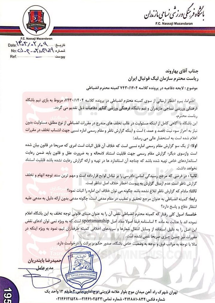 باشگاه نساجی مازندران با ارسال نامه‌ای به سازمان لیگ به اخطار کمیته انضباطی معترض شد.