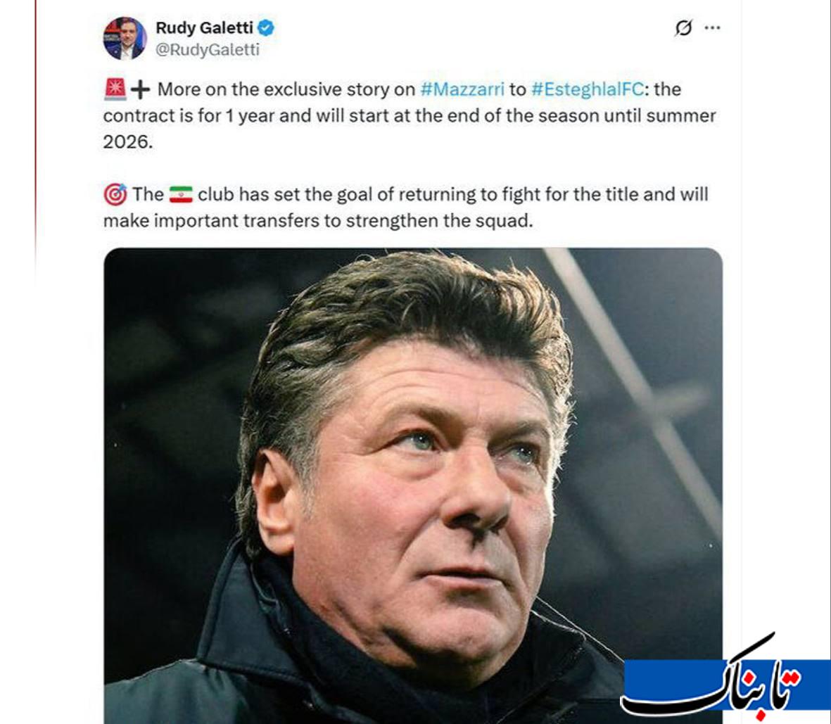 خبرنگار ایتالیایی با انتشار توییتی جدید از امضای قرارداد یک ساله باشگاه استقلال با والتر ماتزاری تا پایان تابستان ۲۰۲۶ خبر داد