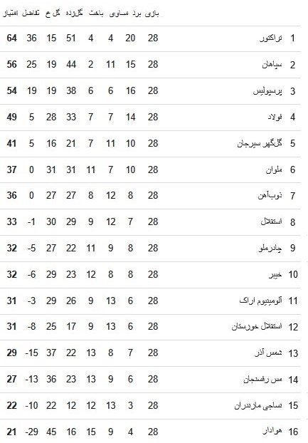 جدول ردهبندی لیگ برتر فوتبال