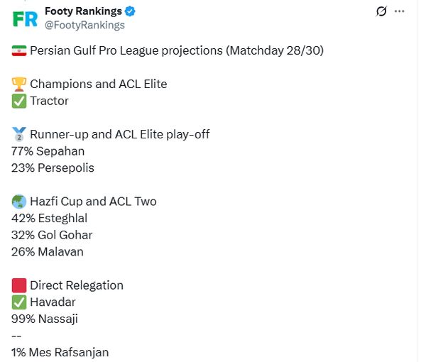 سایت معتبر آسیایی مینویسد که پرسپولیس با ۲۳ درصد شانس دوم ایران برای کسب سهمیه پلیآف لیگ نخبگان آسیا است.