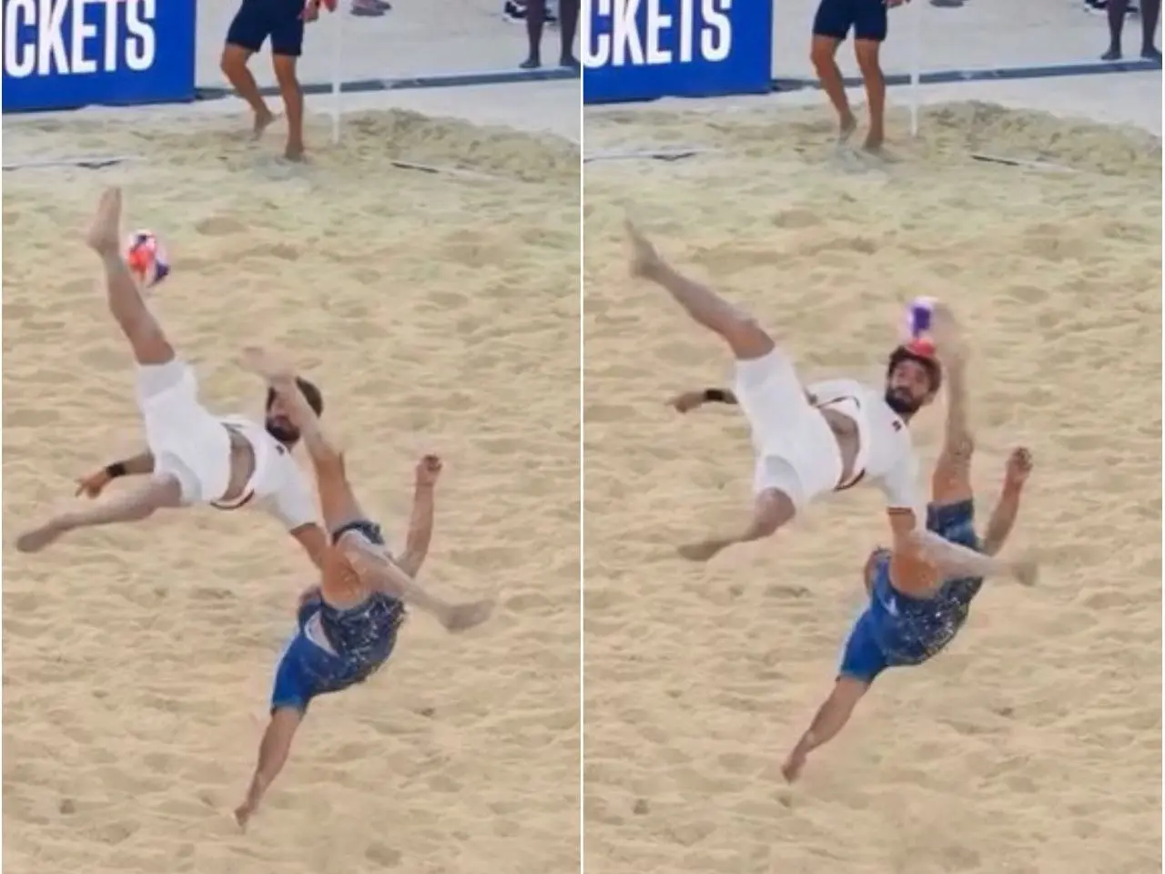 در جریان این دیدار یک صحنه تماشایی و نادر رقم خورد که بازتاب گستردهای در فضای مجازی، بهویژه در صفحه رسمی فدراسیون جهانی فوتبال (فیفا)، داشت. در حالی که ضربات قیچی برگردان یکی از حرکات رایج و مرسوم در فوتبال ساحلی محسوب میشود، والنتین بنیتز، بازیکن تیم ملی پاراگوئه، پس از کنترل سینه و ارسال توپ به هوا، آماده اجرای این حرکت شد. او با دقت بالا محاسبات خود را انجام داد و ضربه قیچی برگردان خود را به زیبایی روانه دروازه ایران کرد، اما ناگهان اتفاقی غیرمنتظره رخ داد.