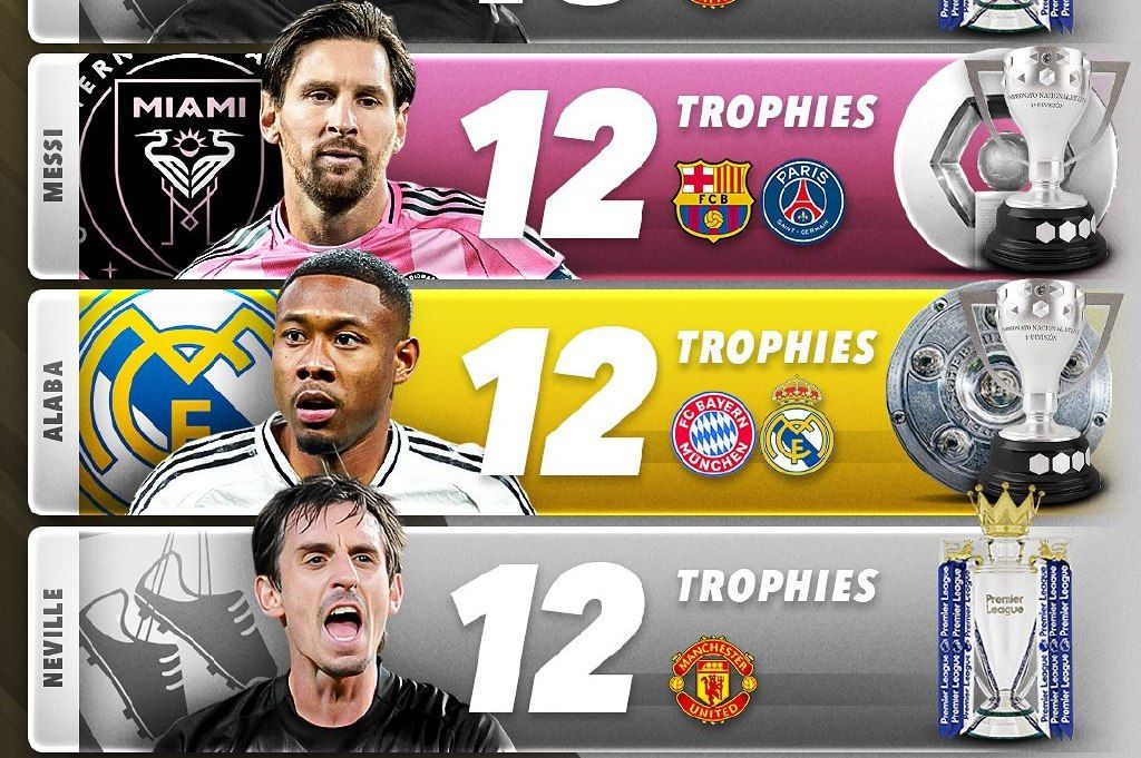همراه با لیونل مسی، داوید آلابا، مانوئل نویر، پاکو خنتو و گری نویل نیز با ۱۲ عنوان قهرمانی لیگ، جزو ۵ نفر برتر این فهرست هستند.
