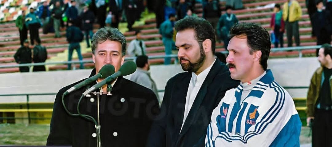 این عکس اسفند سال ۱۳۷۶ در ورزشگاه آزادی و پس از بازی استقلال مقابل سایپا گرفته شد. در مقطعی که ناصر حجازی عزیز هدایت استقلال را بر عهده داشت و حمید علیدوستی محجوب هم روی نیمکت سایپا مینشست. هنگامی که مسابقه این دو تیم به پایان رسید، جواد خیابانی که گزارش بازی را بر عهده داشت، از هر دو نفر برای شرکت در یک مصاحبه مستقیم دعوت کرد و این قاب سه نفره شکل گرفت. هنوز فراموش نکردهایم که علیدوستی در ابتدای آن مصاحبه چه احترام ویژهای به ناصر حجازی گذاشت و از اسطوره فقید آبیها تمجید کرد. احترامی که به وضوح میتوان گفت حالا متاسفانه در فوتبال ایران به مراتب کمرنگتر شده است.