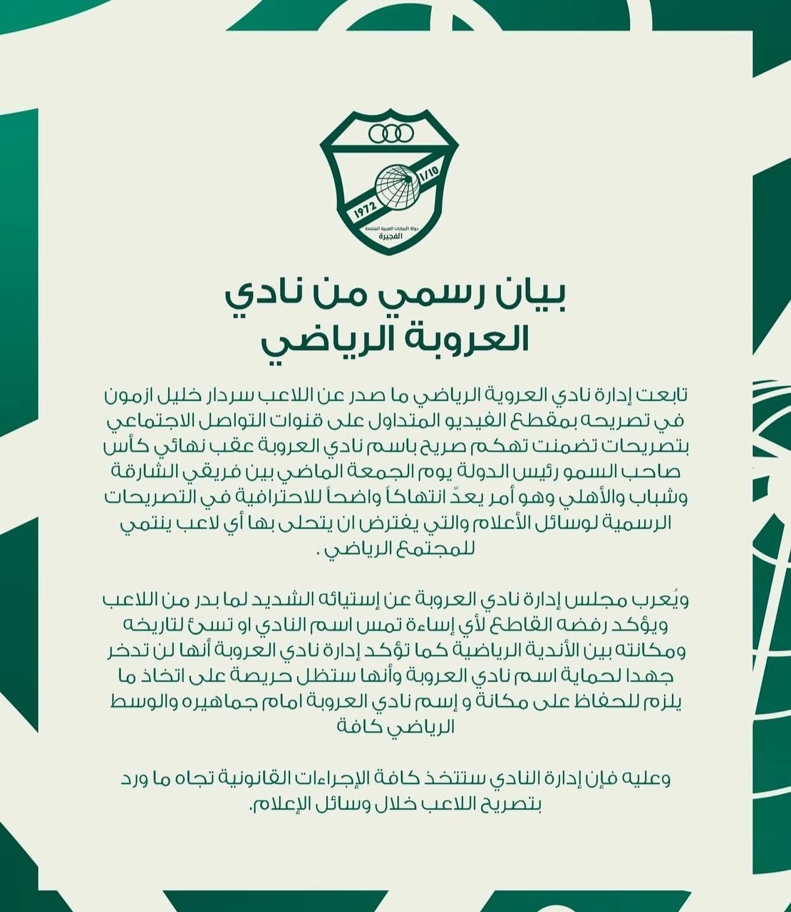 همین جمله باعث شد باشگاه العروبه با انتشار بیانیهای رسمی، نسبت به آن واکنش نشان دهد و صحبتهای آزمون را «توهینآمیز» و «دور از شأن یک بازیکن حرفهای» توصیف کند. در این بیانیه، باشگاه العروبه تأکید کرده که این اظهارات، حرمت جامعه محلی الفجیره و باشگاه العروبه را زیر سؤال برده است.
