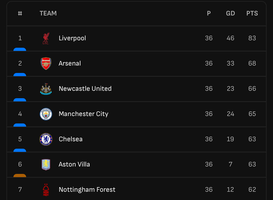 وضعیت جدول در پایان هفتۀ سی‌وششم لیگ برتر در فصل ۲۵–۲۰۲۴ بدون وقایع غیرمترقبە، ظاهراً فقط امکان جابه‌جایی تیم‌های چهارم و پنجم وجود دارد: