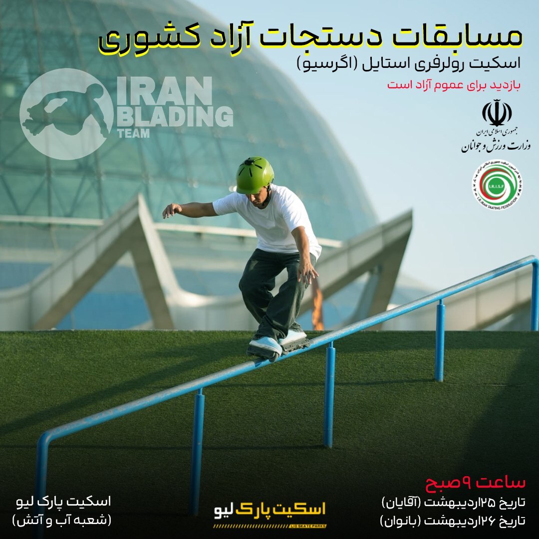 مسابقات کشوری رولرفری استایل (اگرسیو) در بخش آقایان و بانوان در اسکیت پارک لیو آب و آتش برگزار میشود.