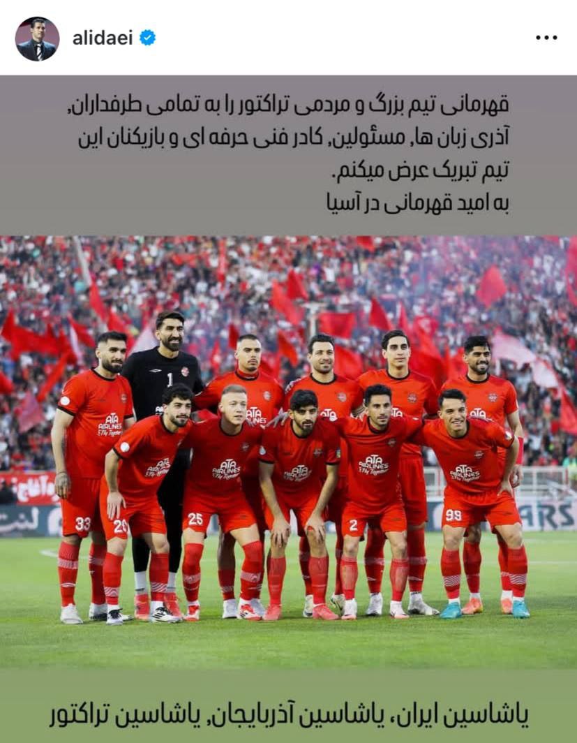 بیستوچهارمین دوره لیگ برتر ایران ساعتی پیش با برگزاری آخرین بازی و برتری ۱-۳ تراکتور مقابل استقلال خوزستان به پایان رسید. تیتیها توانستند با کسب ۶۸ امتیاز قهرمان فصل ۰۴-۱۴۰۳ لیگ برتر ایران شوند. علی دایی، اسطوره فوتبال ایران با انتشار یک استوری در صفحه خود، قهرمانی قرمزهای تبریز را تبریک گفت و نوشت: