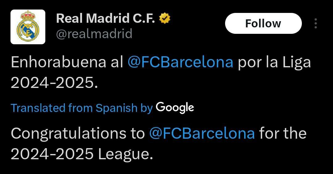 پس از پیروزی بارسلونا مقابل اسپانیول و مسجل شدن قهرمانی لالیگا در فاصله دو هفته به پایان لیگ، رئال مادرید با انتشار توییتی در صفحه X (توییتر) خود، به شاگردان هانسی فلیک بابت این قهرمانی تبریک گفت.