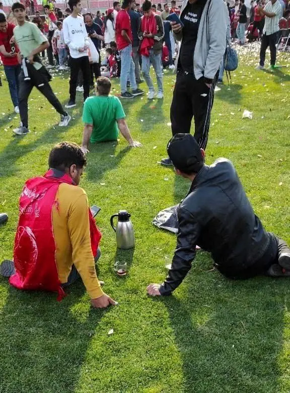 کار به جایی رسید که سکوهای ورزشگاه تا حدود زیادی خالی شده بود اما میانه زمین مملو از هواداران بود. اتفاقی که شاید به خاطرش جشن هم نیمه کاره ماند. در این بین شاید متفاوتترین تصویر همین باشد که از دو هوادار تبریزی ثبت شده: دو نفری که روی چمن ورزشگاه یادگار امام نشستهاند و با آرامش خاصی مشغول نوشیدن چای هستند – فضایی شبیه گردش های سیزده به در!