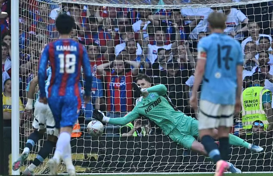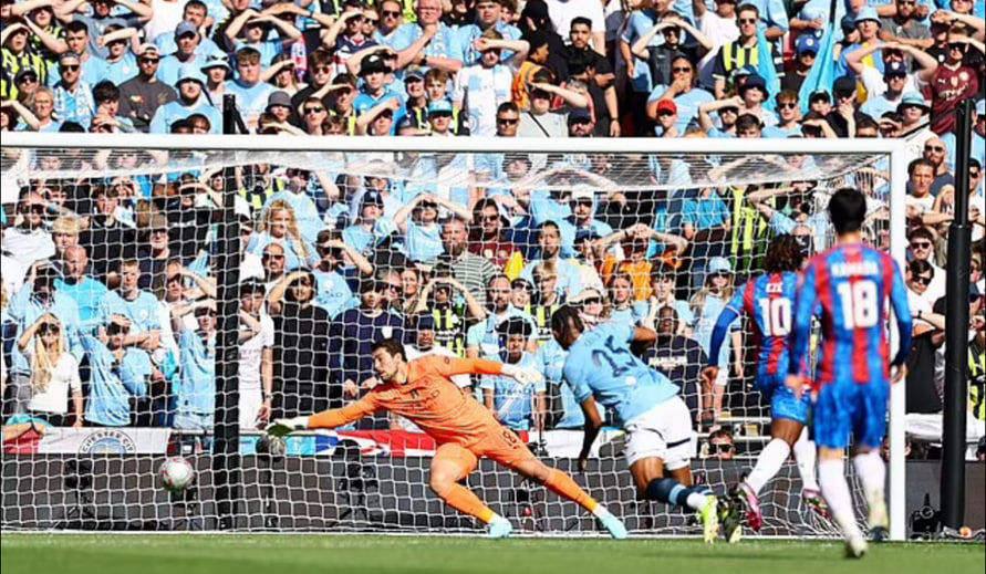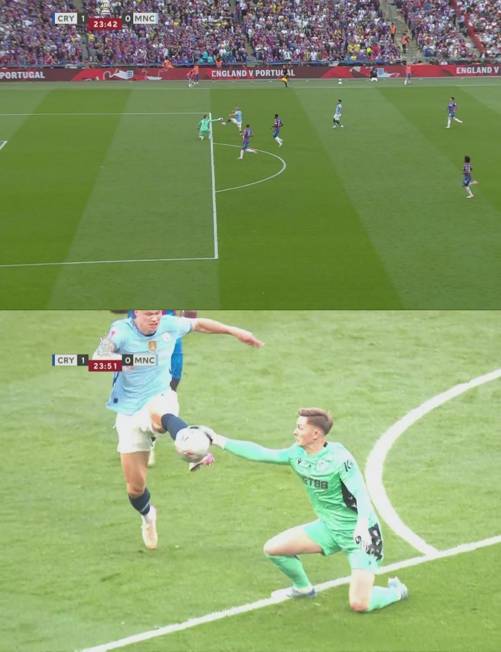 دین هندرسون، دروازهبان پالاس، باید بهخاطر لمس توپ بیرون از محوطۀ جریمه و سلب موقعیت گل ارلینگ هالند از بازی اخراج میشد، اما او در میان حیرت همگان در میدان ماند و بعد، طبق قاعدهای نانوشته، ضربۀ پنالتی عمر مرموش را با زیبایی مهار کرد.