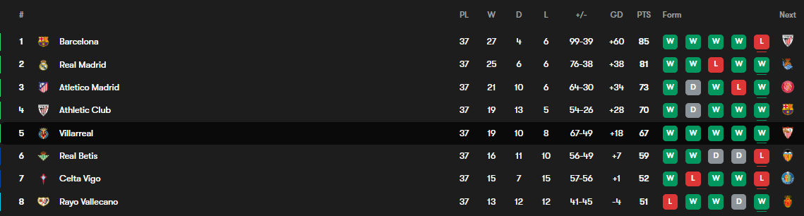 با این سه امتیاز و البته شکست رئال بتیس مقابل اتلتیکو مادرید، جایگاه ویارئال در رده پنجم جدول تثبیت شد. با توجه به این که لالیگای اسپانیا این فصل ۵ سهمیه لیگ قهرمانان در اختیار دارد، زیردریاییهای زرد هم به فصل ۲۶-۲۰۲۵ لیگ قهرمانان اروپا راه پیدا کردند.