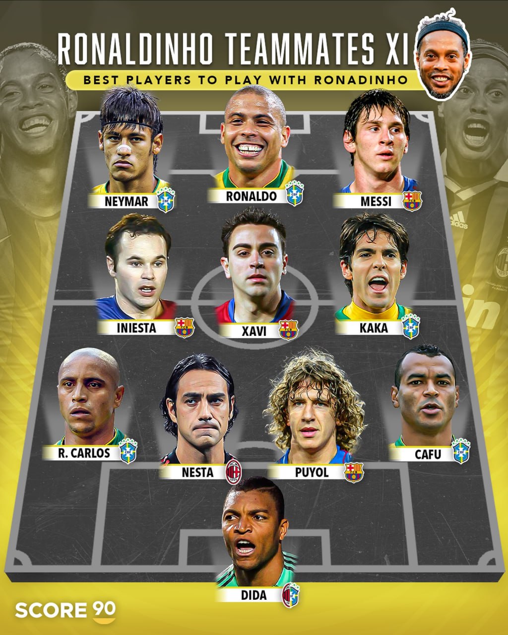 حالا اگر بخواهیم یک تیم منتخب از بهترین همتیمیهای رونالدینیو بسازیم، نامهایی مانند لیونل مسی و رونالدو نازاریو به چشم میخورند.