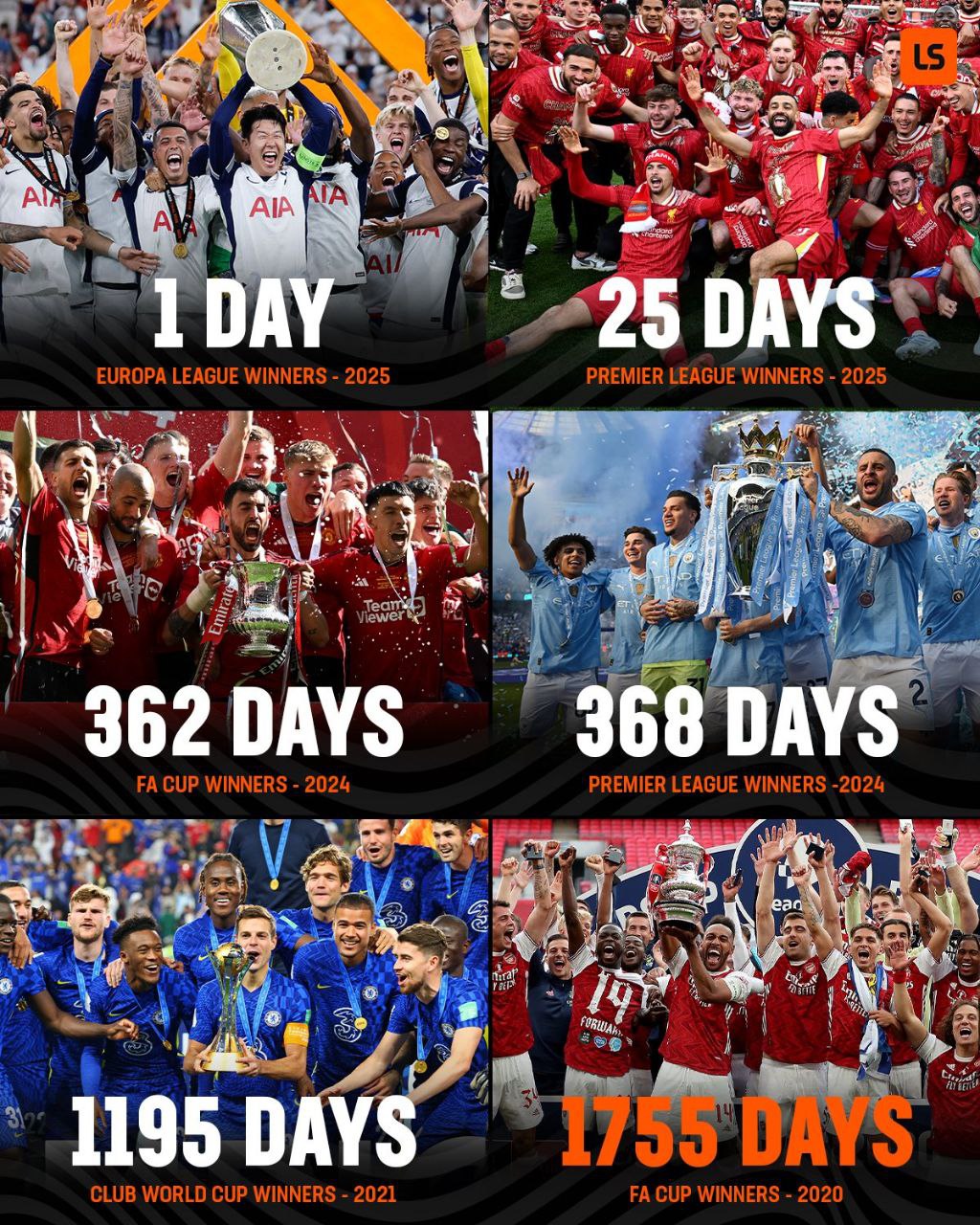 از آخرین قهرمانی تاتنهام ۶۲۹۶ روز میگذشت تا اینکه آنها با فتح لیگ اروپا سرانجام این طلسم را شکستند. حالا از بین ۶ تیم بزرگ فوتبال انگلیس معروف به تاپ سیکس، آرسنال طولانیترین روند بدون جام را سپری میکند. از آخرین قهرمانی توپچیها ۱۷۵۵ روز میگذرد.