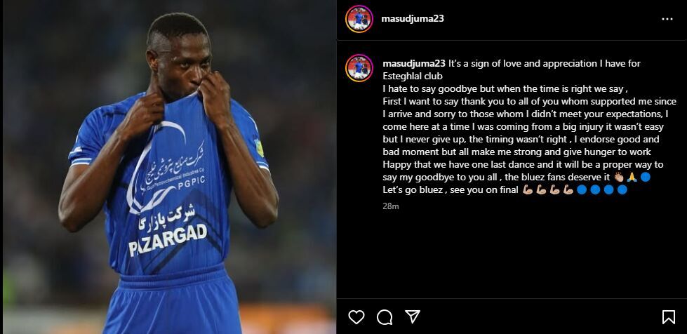 مسعود جمعه مهاجمکنیایی استقلال با انتشار پستی اعلام کرد که بازی فینال جامحذفی آخرین بازی او برای استقلال خواهد بود.