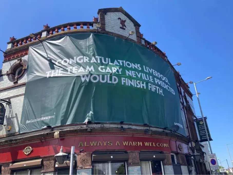 بنری بزرگ به مناسبت قهرمانی لیورپول در نزدیکی ورزشگاه آنفیلد روی یک کافه معروف نصب شده است. این بنر به گری نویل، به دلیل پیشبینیاش در ابتدای فصل، طعنه زده است.