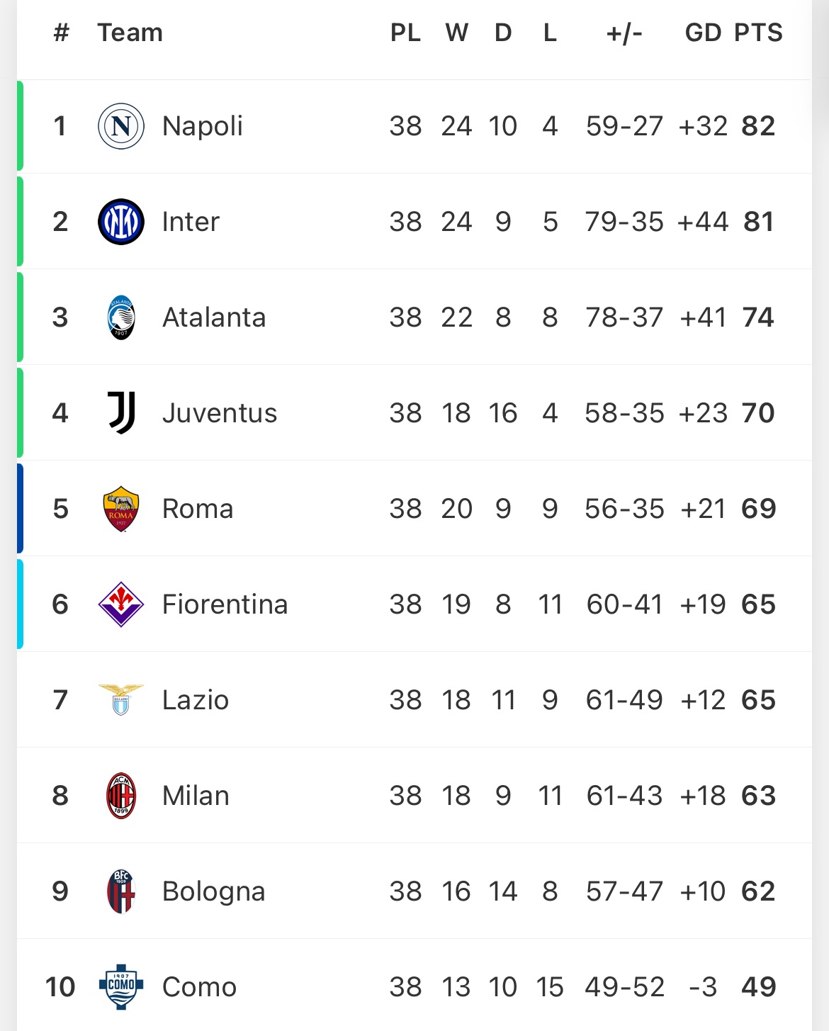 - سهمیه لیگ قهرمانان اروپا: ناپولی، اینتر، آتالانتا و یوونتوس
