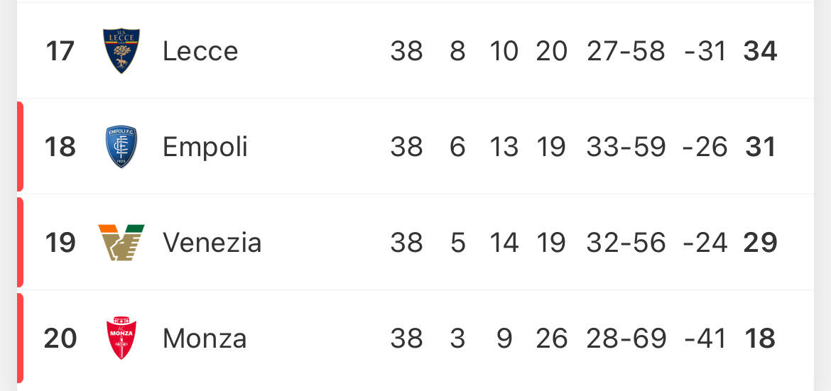 - تیمهای سقوطکننده: مونتزا، ونتزیا و امپولی