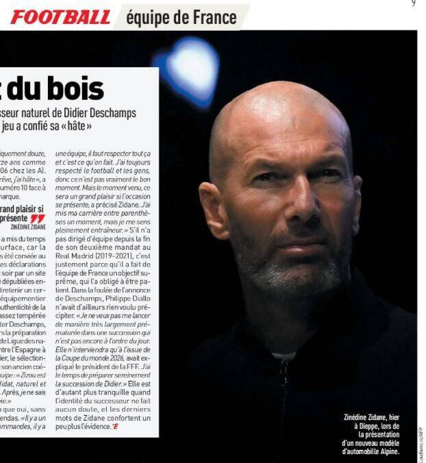 چندی پیش، در ماه فوریه، دیدیه دشان در گفتوگویی با نشریه معتبر «اکیپ»، درباره همتیمی سابقش چنین گفت: «زیزو یک گزینه بسیار خوب، طبیعی و باید بگویم مورد انتظار است. اما نمیدانم که آیا خودش چنین تمایلی دارد یا نه.» بهنظر میرسد امروز این تردید برطرف شده، هرچند زیدان بدون شتابزدگی، آرام و متین سخن گفت. او افزود: «در حال حاضر مربیای بر سر کار است، تیمی وجود دارد، باید به همه اینها احترام گذاشت، و من همین کار را میکنم. همیشه به فوتبال و آدمهایش احترام گذاشتهام، بنابراین اکنون زمان مناسبی نیست. اما وقتی زمانش برسد، اگر فرصت فراهم شود، افتخار بزرگی خواهد بود. مدتی است که حرفهام را کنار گذاشتهام، اما کاملاً خود را مربی میدانم.»