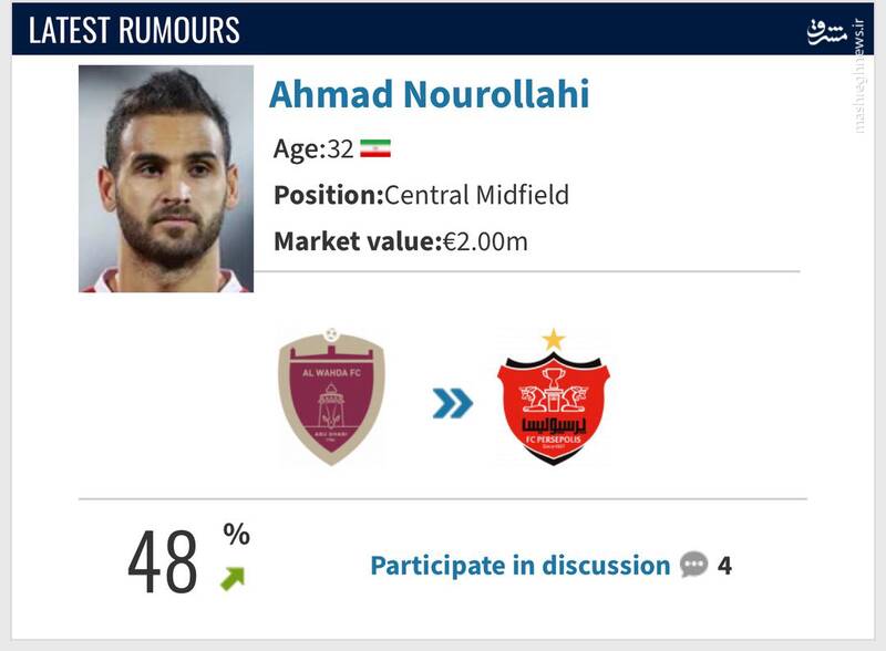 درصد انتقال نوراللهی به پرسپولیس در جدیدترین بروزرسانی ترانسفرمارکت از ۴۸ درصد به ۳۸ درص کاهش یافت.