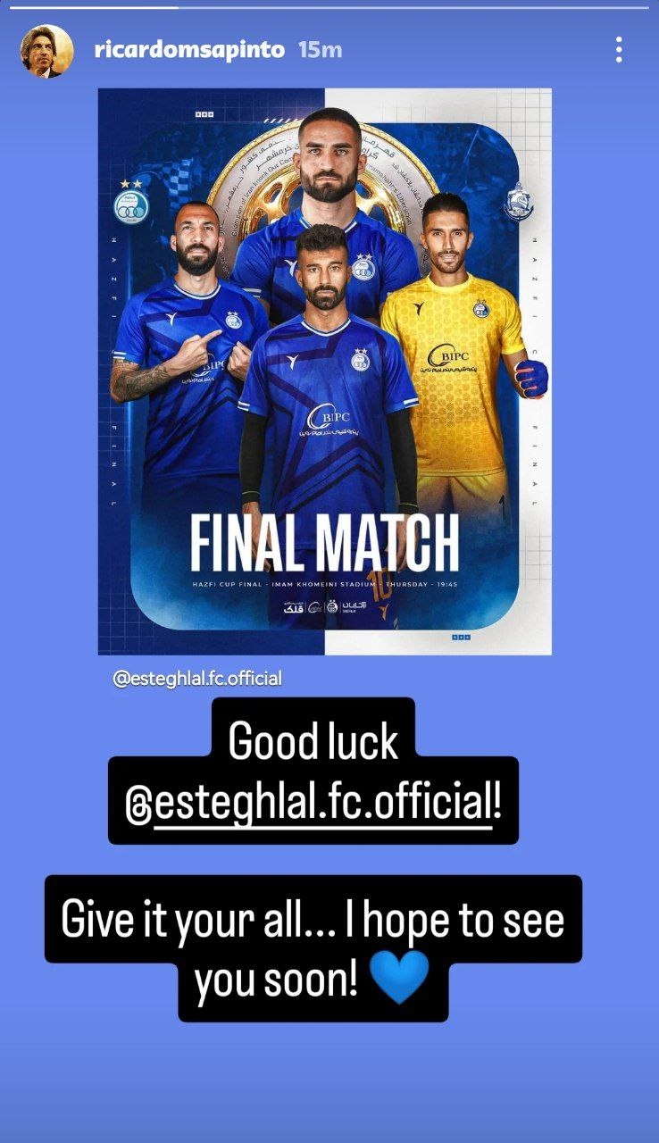 به گزارش تابناک به نقل از ورزش سه، در شرایطی که استقلال از ساعاتی دیگر باید در فینال رقابتهای جام حذفی به مصاف تیم فوتبال ملوان برود، انتشار یک استوری از سوی ریکاردو ساپینتو، سرمربی سابق این تیم، شایعات بازگشت او به جمع آبیها را دوباره داغ کرده است. ساپینتو در صفحه شخصی خود تصویری از پوستر دیدار فینال جام حذفی که توسط باشگاه استقلال منتشر شده بود، به اشتراک گذاشت و برای تیم سابقش آرزوی موفقیت کرد.