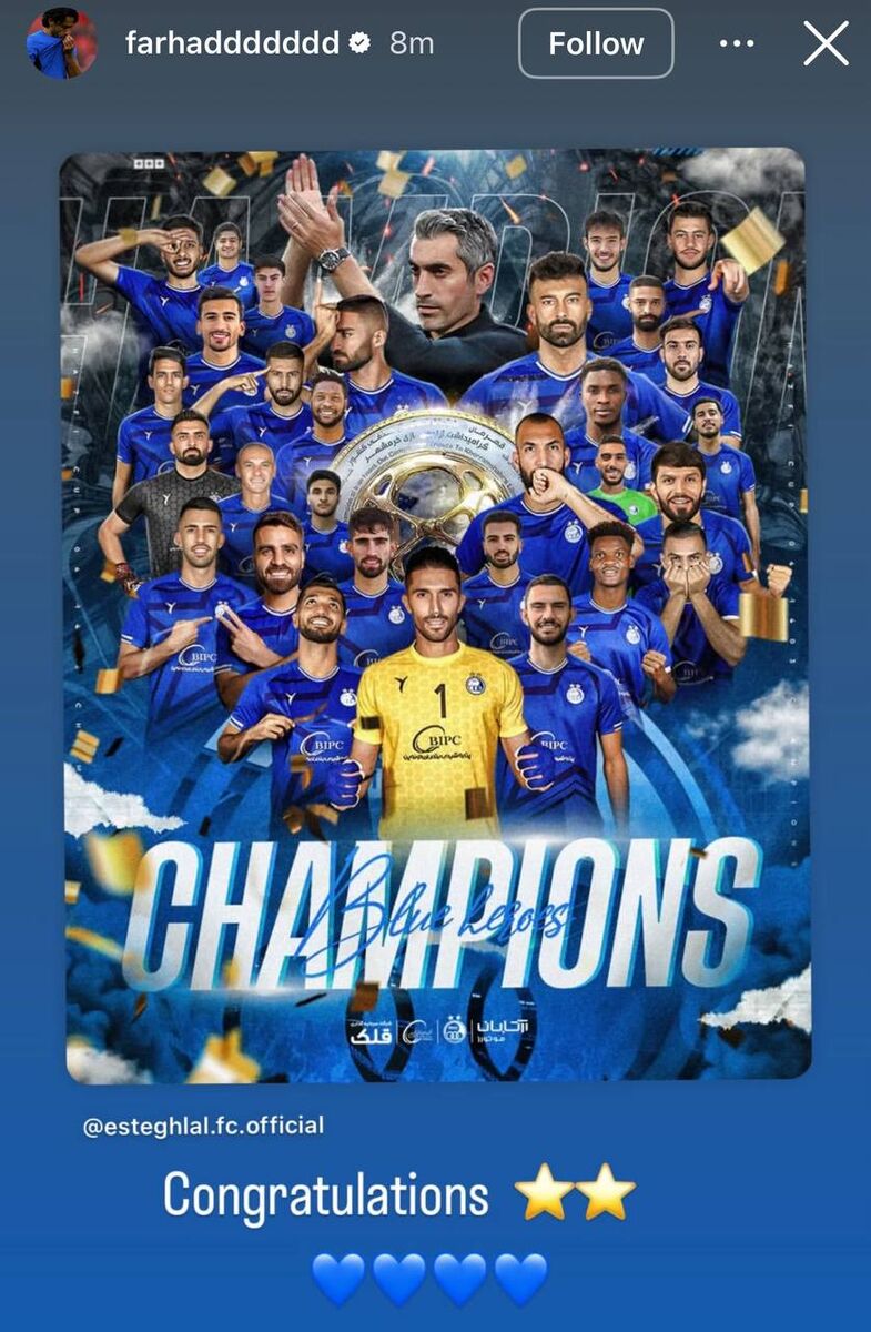 بعد از قهرمانی آبیها، فرهاد مجیدی سرمربی و بازیکن محبوب این تیم با انتشار یک استوری به موفقیت تیم محبوبش با مجتبی جباری واکنش نشان داد و فتح این جام را به هشت شاکی تبریک گفت.