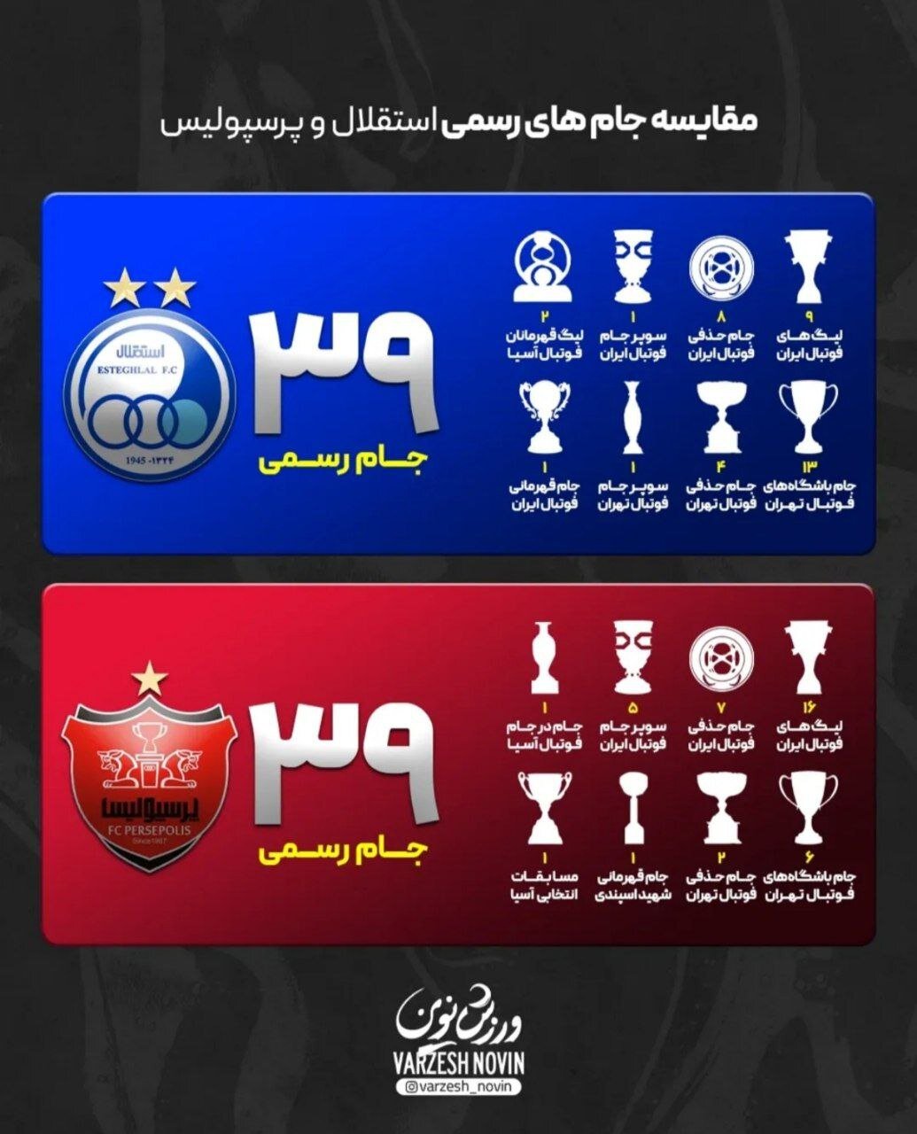 اکنون تعداد جام های استقلال در مقایسه با پرسپولیس در عدد ۳۹ برابر شده است. آبی ها این شانس را دارند تا درسوپرجام و کسب یک جام دیگر، تعداد جام های رسمی خود را به عدد ۴۰ برسانند تا به تنهایی لقب پر افتخارترین تیم ایران را یدک بکشند.