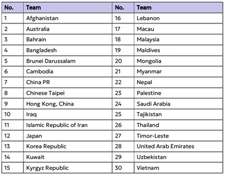 بر همین اساس اسامی ۳۰ تیم شرکت کننده در این دوره از بازیها به شرح زیر است: