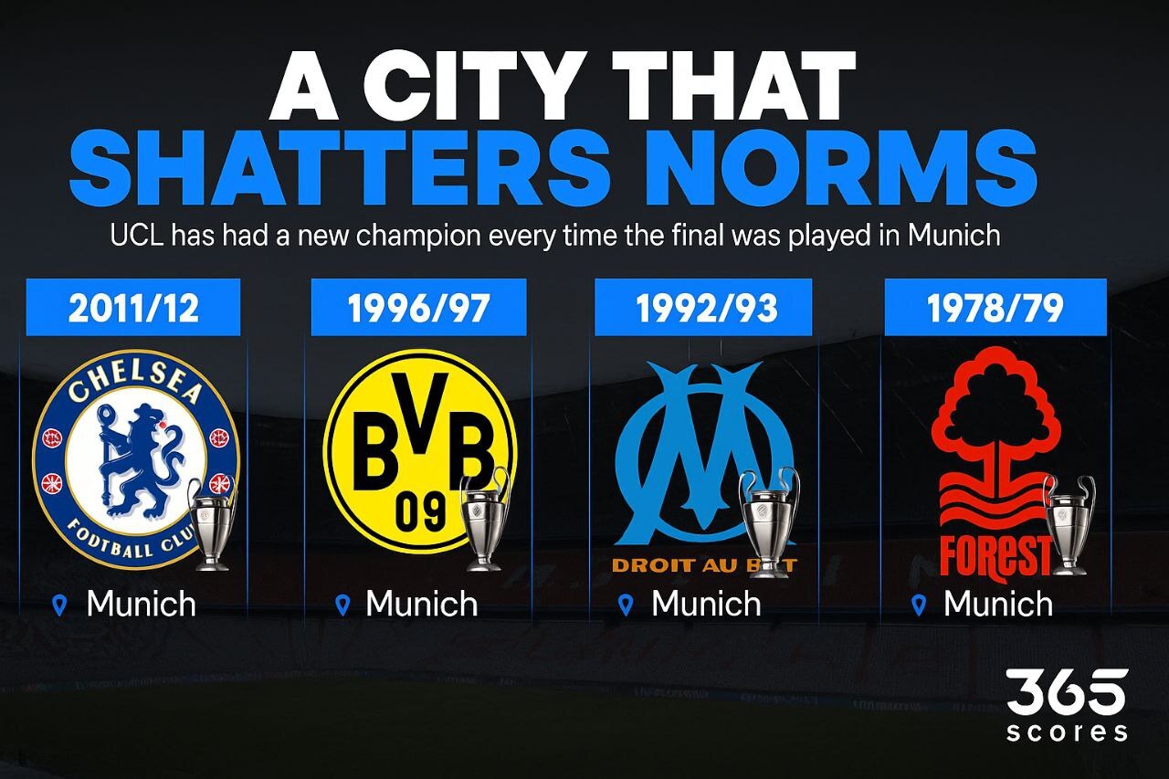 اما یک آمار عجیب در شهر مونیخ نشان میدهد پاری سن ژرمن بیشترین شانس را برای برد در فینال امشب را دارا است. شهر مونیخ تاکنون شاهد چهار فینال اروپایی بوده و هر بار تیمی در این شهر قهرمان شده که پیش از آن سابقه قهرمانی نداشته است. ناتینگهام فارست در سال ۱۹۷۹، مارسی در ۱۹۹۳، دورتموند در ۱۹۹۶ و چلسی در ۲۰۱۲ در مونیخ قهرمان اروپا شدند و برای اولین بار بود که جام را بالای سر میبردند.