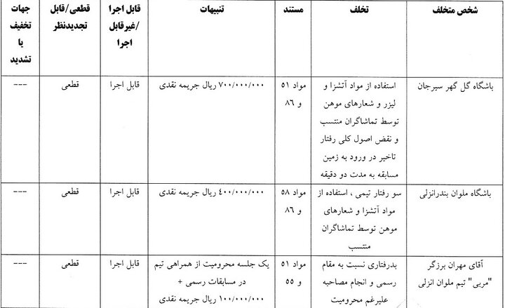 به گزارش خبرگزاری مهر و به نقل از سایت فدراسیون فوتبال؛ رأی تخلفات تیم گل گهر و همچنین مهران برزگر و باشگاه ملوان به شرح زیر است: