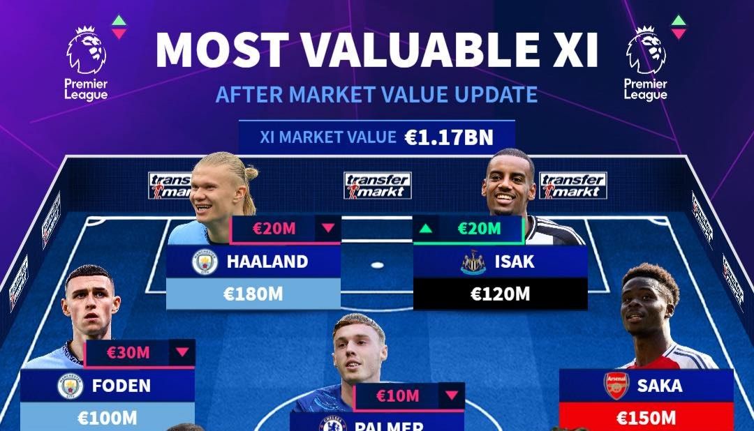ارلینگ هالند همچنان با ارزشی خیرهکننده معادل ۱۸۰ میلیون یورو، در صدر این فهرست قرار دارد. پس از او، بوکایو ساکا با ۱۵۰ میلیون یورو در جایگاه دوم ایستاده و الکساندر ایساک نیز با جهشی چشمگیر، خود را به جمع مهاجمان گرانقیمت لیگ رسانده است.