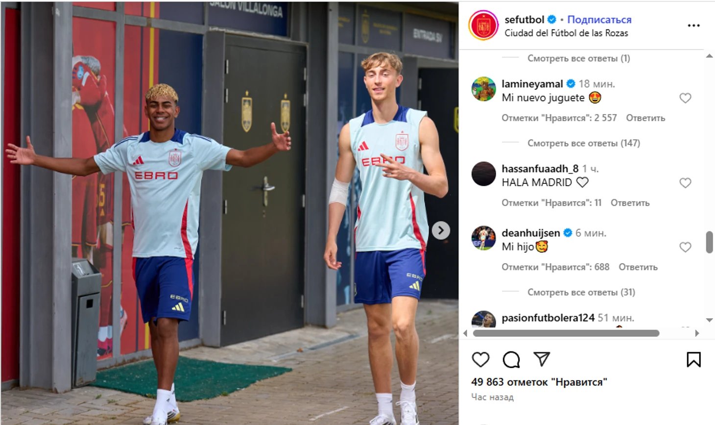 در حالی که حساب رسمی تیم ملی اسپانیا تصویری از این دو بازیکن را در کنار یکدیگر منتشر کرده بود، دین هاوسن در کامنتی با لحنی شوخیآمیز نوشت: «پسرم»، اشارهای طعنهآمیز به یامال. لامین یامال نیز بلافاصله با واکنشی طنازانه پاسخ داد: «اسباببازی جدیدم»، بههمراه ایموجی قلب.
