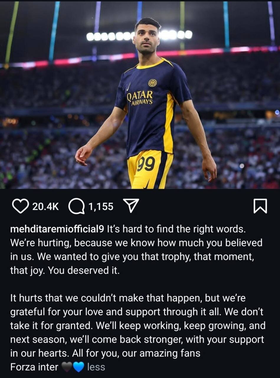 مهدی طارمی پس از شکست اینتر در فینال لیگ قهرمانان اروپا پستی در صفحه اینستاگرام خود منتشر کرد.