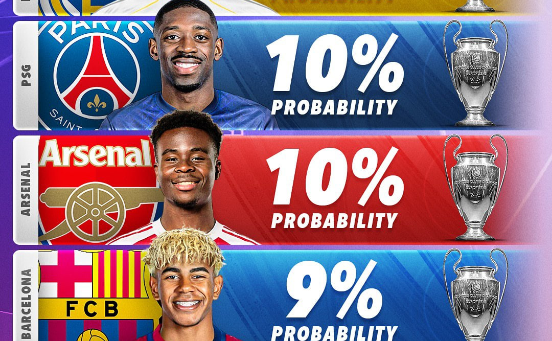 در جایگاه دوم، رئال مادرید با ۱۱٪ احتمال قرار دارد. پرافتخارترین تیم تاریخ لیگ قهرمانان با ۱۵ قهرمانی که همیشه یکی از مدعیان اصلی قهرمانی در اروپا بوده، حالا در فصل دوم حضور کیلیان امباپه در سانتیاگو برنابئو و ترکیب ستارگان جوان و باتجربهاش، بار دیگر نگاهها را به خود جلب کرده است. پاری سن ژرمن و آرسنال نیز با ۱۰٪ احتمال، در رده سوم قرار دارند. پاریسیها پس از کسب اولین قهرمانی خود در اروپا با تکیه بر ستارگانی همچون عثمان دمبله، دزیره دوئه، ویتینیا و خویچا کواراتسخلیا برای دفاع از عنوان قهرمانی خود در اروپا تلاش خواهند کرد. از سوی دیگر، آرسنال با تیمی جوان و منسجم به رهبری میکل آرتتا، امید زیادی دارد که بالاخره موفق به قهرمانی در اروپا شود.