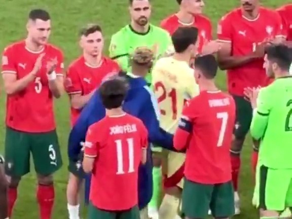 آنچه این ویدیو را مورد توجه قرار داده لحظهای است که لامین یامال وارد تونل افتخار پرتغالیها میشود. یامال ابتدا ژوائو فلیکس را دیده و با او دست داد ولی بلافاصله بعد از فلیکس، کریستیانو رونالدو ایستاده بود. لامین در این لحظه درحالیکه دستش را با بیمیلی به سمت رونالدو دراز کرده رویش را از ستاره بزرگ پرتغالی برمیگرداند و به او بیاعتنایی میکند.