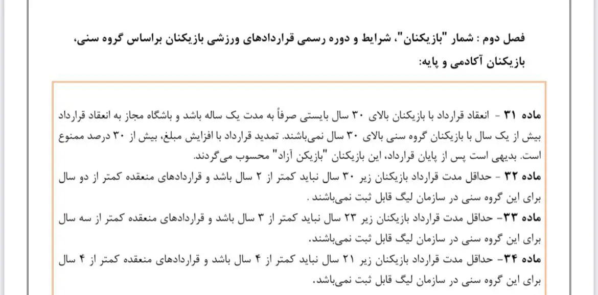 «حداقل مدت قرارداد بازیکنان زیر ۱۹ سال نباید کمتر از چهار سال باشد و قراردادهای منعقده کمتر از ۴ سال برای این گروه سنی در سازمان لیگ قابل ثبت نیست.»