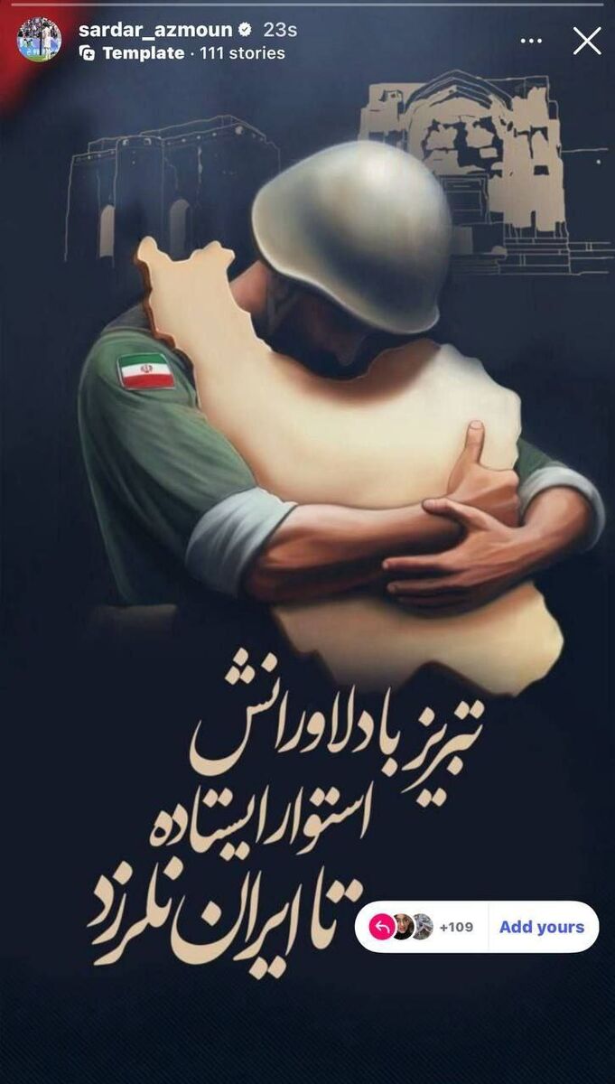 سردار آزمون، ستاره تیم ملی و باشگاه شبابالاهلی امارات نیز با انتشار یک استوری اینستاگرامی به مقاومت مردم ایران واکنش نشان داده است. سردار که بارها از علاقهاش به مردم ترکزبان و باشگاه تراکتور گفته در استوری خود به مقاومت مردم تبریز در برابر جنایات رژیم صهیونیستی اشاره داشت و نوشت: تبریز با دلاورانش ایستاده تا ایران نلرزد.