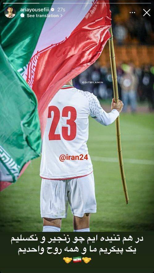 آریا یوسفی، ستاره مطرح تیم ملی و باشگاه سپاهان در واکنش به جنایات رژیم صهیونیستی یک استوری اینستاگرامی با تصویری در کنار پرچم کشور منتشر کرده و نوشته است: در هم تنیدهایم چو زنجیر و نگسلیم؛ یک پیکریم ما و همه روح واحدیم.