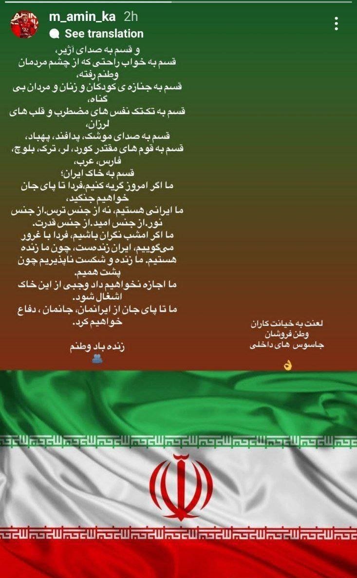 بازیکن پرسپولیس در صفحه شخصی اش نوشت: تا پای جان خواهیم جنگید ما ایرانی هستیم.