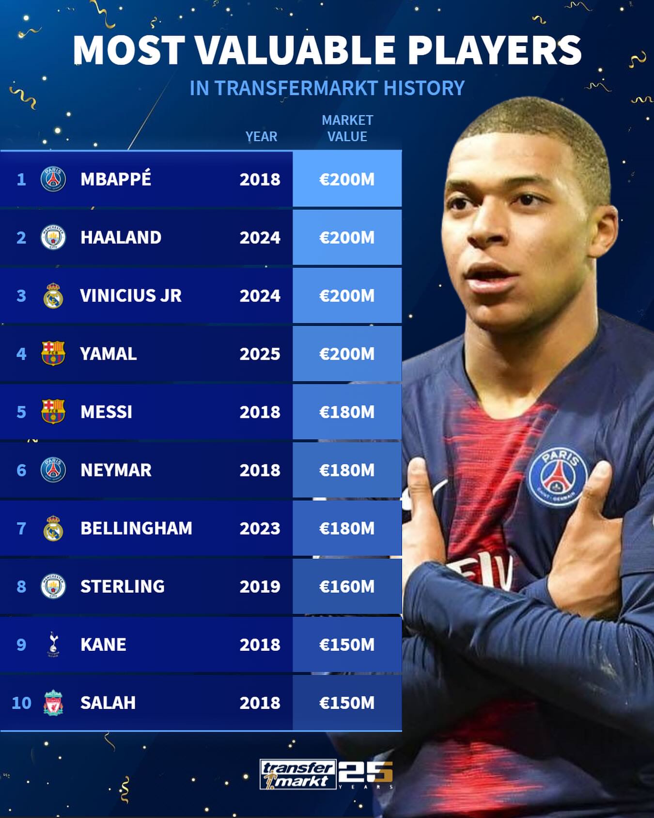 جالب آنکه امباپه اولین بازیکنی بود که در سال ۲۰۱۸ به این رقم خارقالعاده دست یافت؛ درحالیکه هالند و وینیسیوس هر دو در سال ۲۰۲۴ و یامال در سال ۲۰۲۵ به این نقطه رسیدند. حضور لامین یامال، پدیده جوان و ۱۷ سالهی بارسلونا، در این لیست بالاتر از نامهای تثبیتشدهای همچون لیونل مسی و نیمار، نشان از استعداد و آینده درخشان این بازیکن آیندهدار دارد. در رتبههای بعدی نیز نامهایی چون لیونل مسی، نیمار، جود بلینگام، رحیم استرلینگ، هری کین و محمد صلاح به چشم میخورند که همگی در مقاطعی از دوران خود به اوج بازار نقلوانتقالات رسیدند.