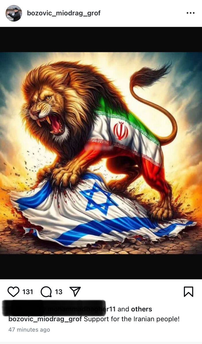 بوژوویچ یکی از کسانی بود که در زمان حضور در ایران هم روحیات خاص خود را با حمایت از دشمنی علیه آمریکا و اسراییل نشان داده بود و در این مدت هم از ایران در جنگ با اسراییل حمایت کرده بود، دقایقی پیش بازهم یک پست در صفحهاش بارگزاری کرد با این مضمون و طرح که ایران مثل شیر اسراییل را به زانو در آورده است. او در توضیح این پست هم نوشت که از مردم ایران حمایت میکند.