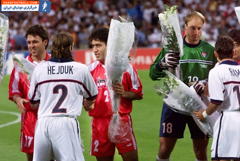 تیم ملی ایران در اولین حضورش در آرژانتین موفق به کسب پیروزی نشد، اما ۲۰ سال بعد در فرانسه آن را جبران کرد. جلال طالبی و بازیکنانش بعد از شکست یک بر صفر مقابل یوگسلاوی توانستند آمریکا را در بازی دوم شکست دهند و ۲ بر یک برنده شوند. به دلیل تنشهای سیاسی شدید بین دو کشور، این مسابقه بسیار فراتر از مسائل ساده ورزشی بود. آن شب در لیون، تماشاگران شاهد رویدادی بودند که بازتاب جهانی داشت. در واقع، قبل از شروع بازی دو تیم با همراهی داور اورس مایر با هم عکس میگیرند و بازیکنان ایران پس از عکس رسمی، دسته گلی را به نشانه صلح به حریف تقدیم میکنند.