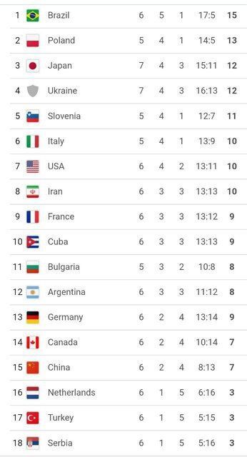 تیم ملی ایران اکنون از نظر امتیاز با آمریکا و ایتالیا برابر است و تنها ۵ امتیاز با برزیل صدر جدولی فاصله دارد.