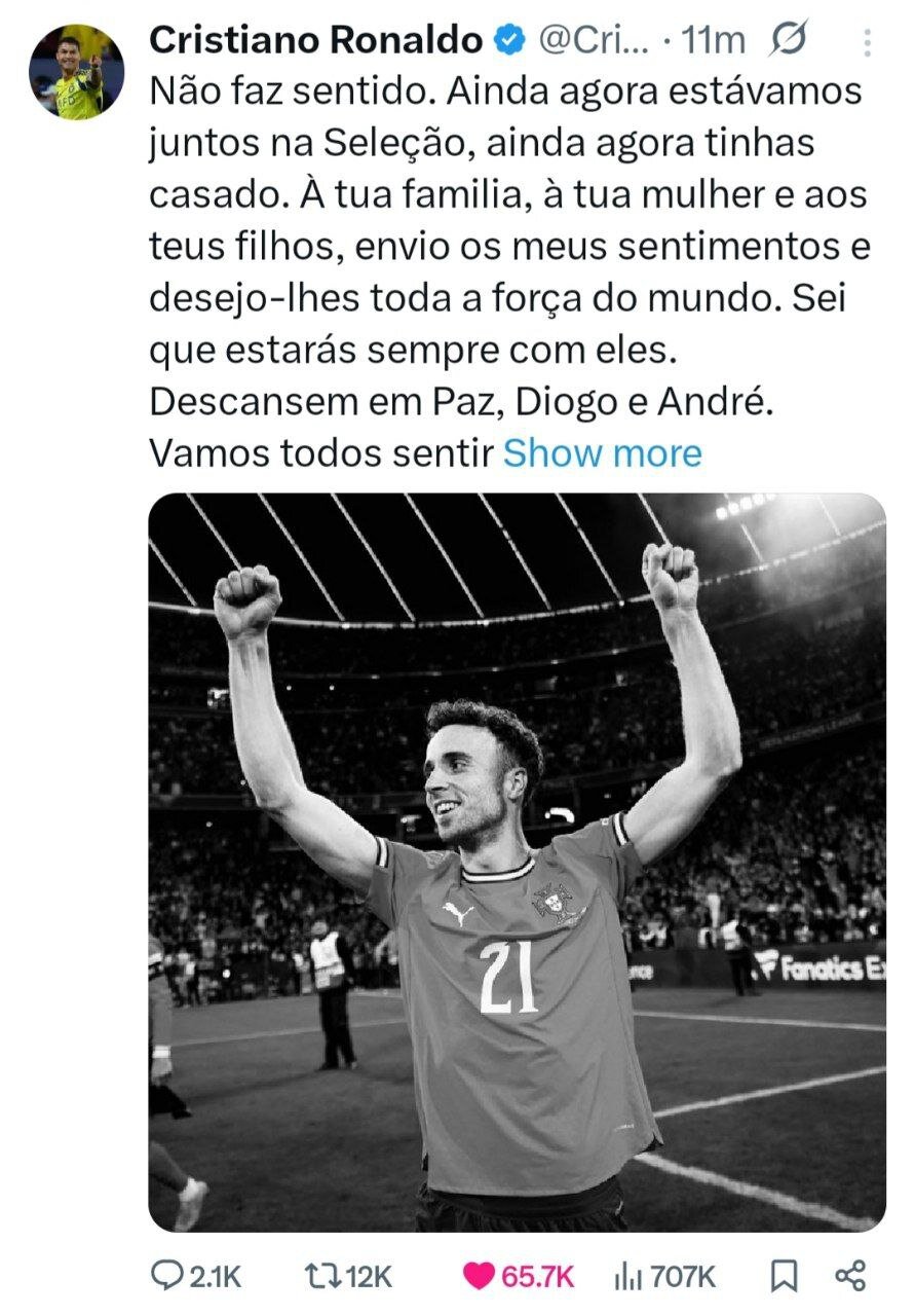 کریستیانو رونالدو، کاپیتان تیم ملی پرتغال پس از مرگ دیگو ژوتا در اینستاگرام خود نوشت: