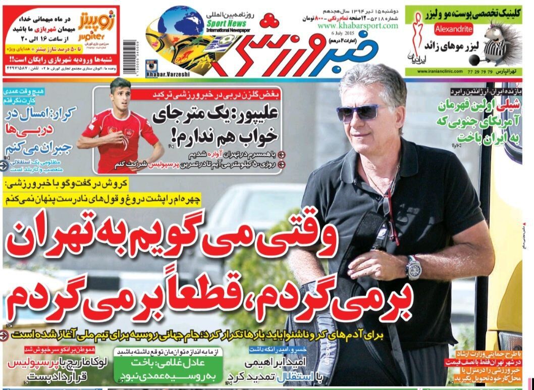 بازخوانی صفحه اول خبرورزشی؛ عکس جلد روزنامه خبر ورزشی در تاریخ پانزدهم تیرسال ۱۳۹۴ را ملاحظه میکنید.