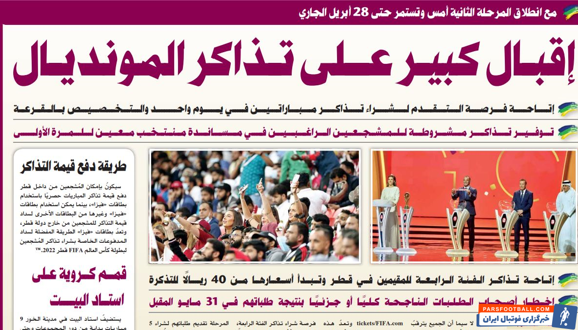 نشریه قطری نوشت: بلیت فروشی مرحله دوم مسابقات جام جهانی از روز گذشته با استقبال بی نظیر آغاز شد. با توجه به اینکه در مرحله دوم تیم ها رقبای خود را شناختند هواداران استقبال بیشتری کردند تا از تیم ملی کشورشان حمایت کنند و در بازی های معین تیم کشورش حضور پیدا کنند.