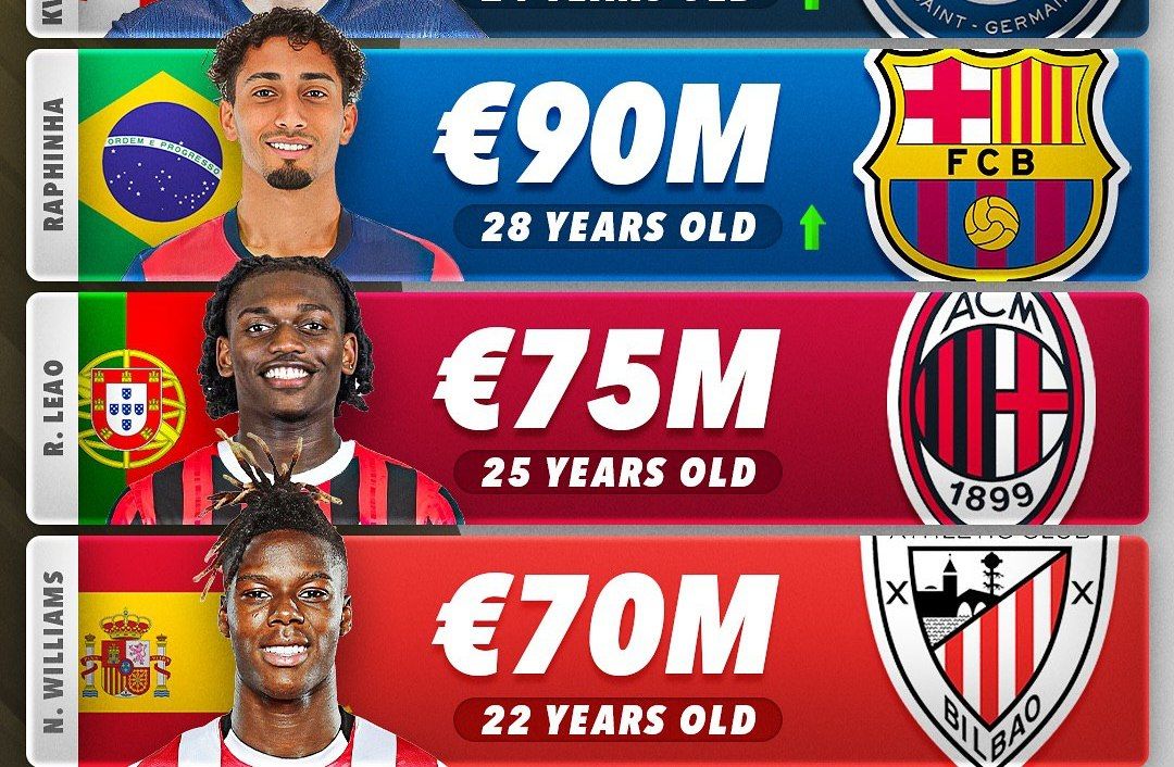 رافائللیائو، وینگر پرتغالی میلان و نیکوویلیامز که بهتازگی با اتلتیک بیلبائو تمدید کرده، در جایگاههای چهارم و پنجم حضور دارند.