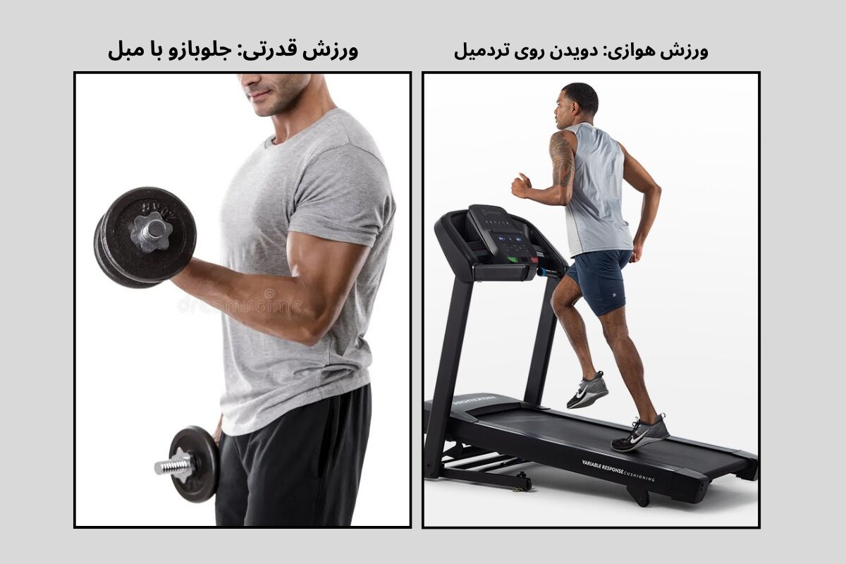 یک ورزشکار در حال تمرین قدرتی با دمبل و یک ورزشکار در حال تمرین هوازی روی تردمیل